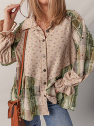 Floral/ plaid print with distressed look, fits roomy, button closure.