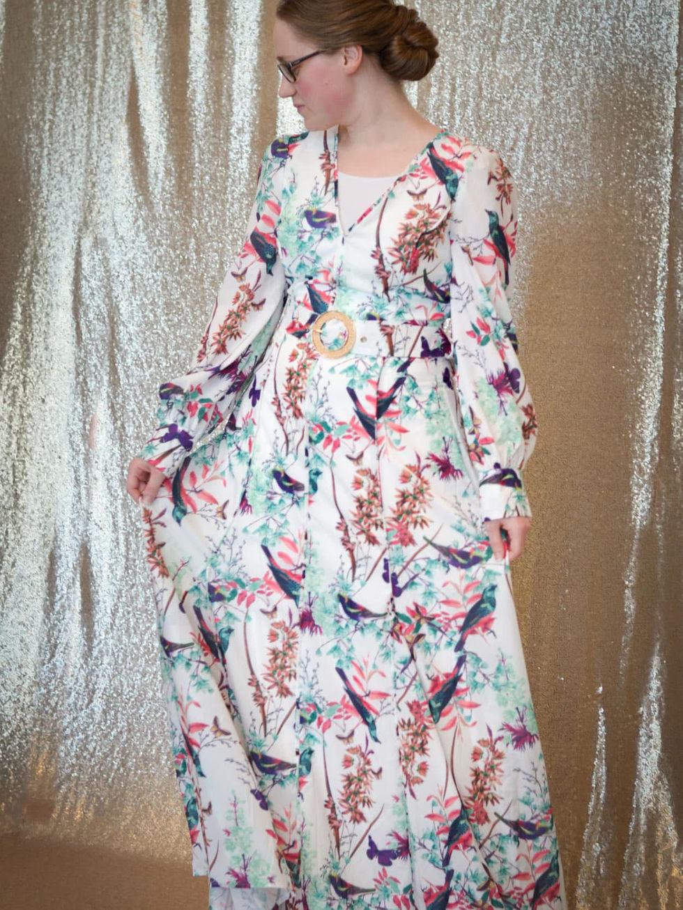 Multi Print Belted Bird Maxi Dress